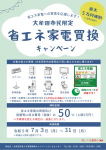 大牟田市の方必見!! 大牟田市内の販売店で、対象の省エネ家電を買換えた費用の50%(最大5万円)が補助金の交付対象となります。