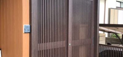 現地調査後既存の扉 丁番部が門柱に埋込の為、カット撤去後に柱付門扉セットをご提案しました