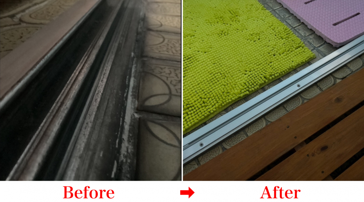 折れたレールから水が漏れないように処理を行い、新しい枠でカバーをかけることで水密性を確保し黒く汚れた枠もきれいになりました。また0.75坪の浴室のため 開閉の際幅を取らない中折れドアをご提案。 出入りの段差も以前と変わらないように取り付けしました。