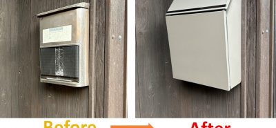 戸車の故障でレールが折れてしまい開閉ができなくなった古い浴室引き戸を、開閉が楽で開けたときに浴室側に幅を取らない中折れドアに取り替えを行いました。レールが削れ黒く汚れた元の枠もカバーをすることできれいになりました。