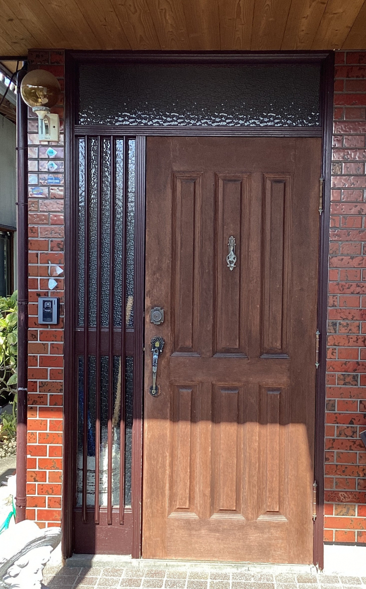 築40年ぐらいの木製の玄関ドアの鍵が壊れたので玄関を取替たいとのことでイベントに来ていただきました。