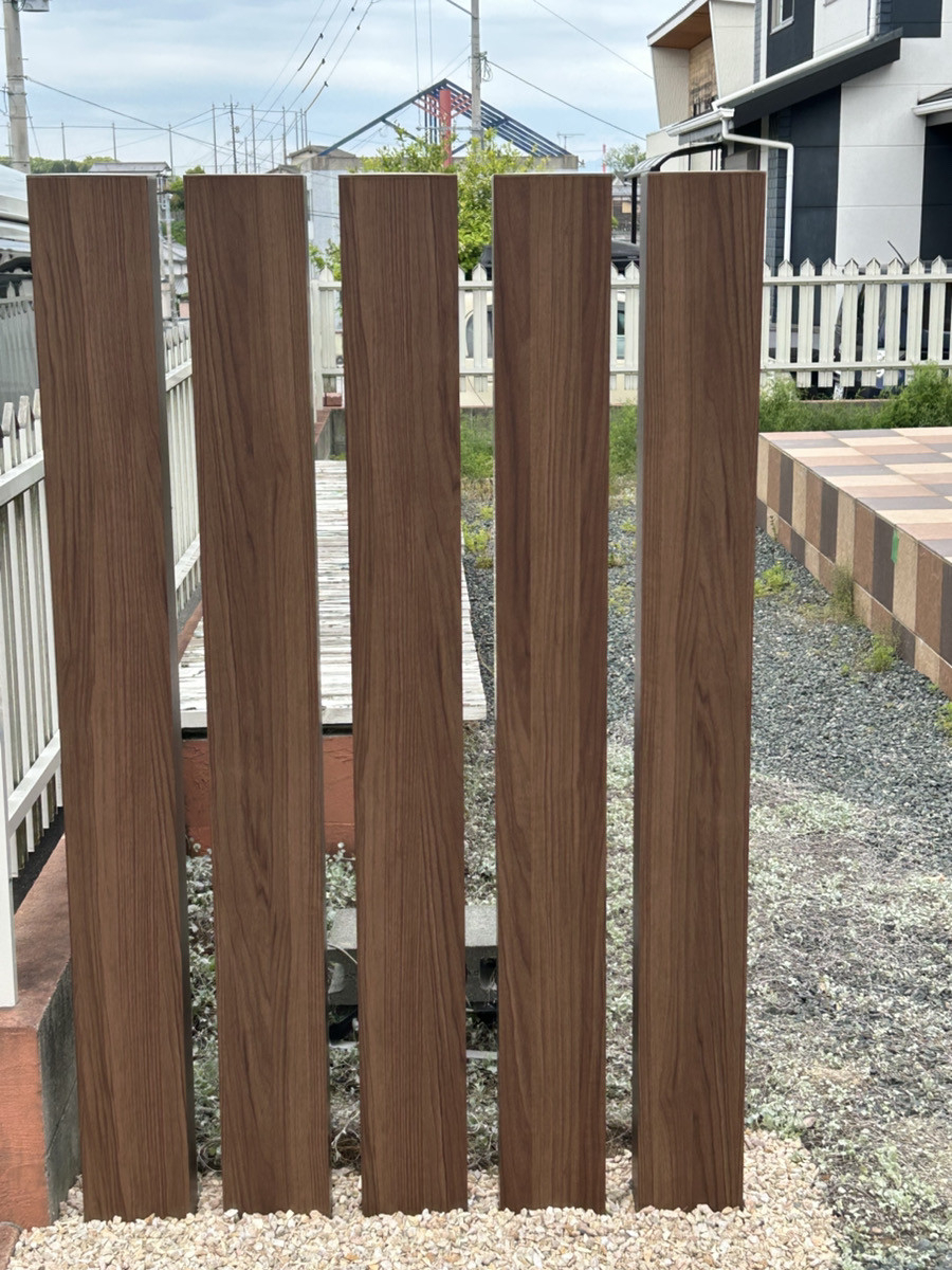 腐食し難いアルミ材質ですし、木質感あふれるラッピング仕様のデザイナーズパーツで門柱を表現させて頂きました。